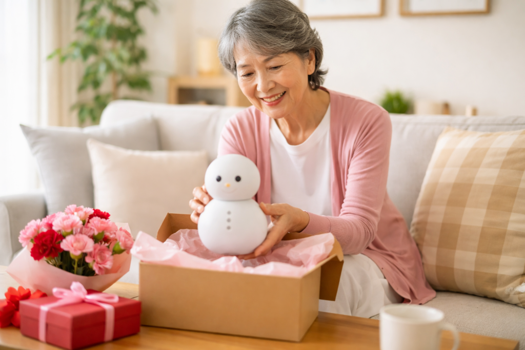 しかも、母の日というイベントにのせることで、見守り機器を押しつける雰囲気がかなりやわらぎます。いきなり監視サービスをすすめると拒否されやすい家庭でも、かわいいロボットを通してなら受け入れられやすいんですよね。親の自尊心を傷つけずに安心を贈れるというのが、この商品のいちばん大きな価値です。高齢の親にとっては、あからさまな介護用品よりも、自分の暮らしにそっとなじむもののほうが受け取りやすいですし、贈る側も「管理するために渡す」のではなく「元気に過ごしてほしいから渡す」という伝え方がしやすくなります。